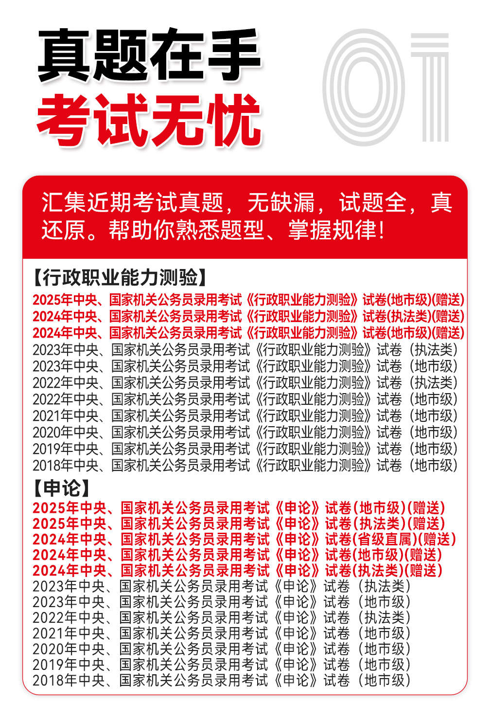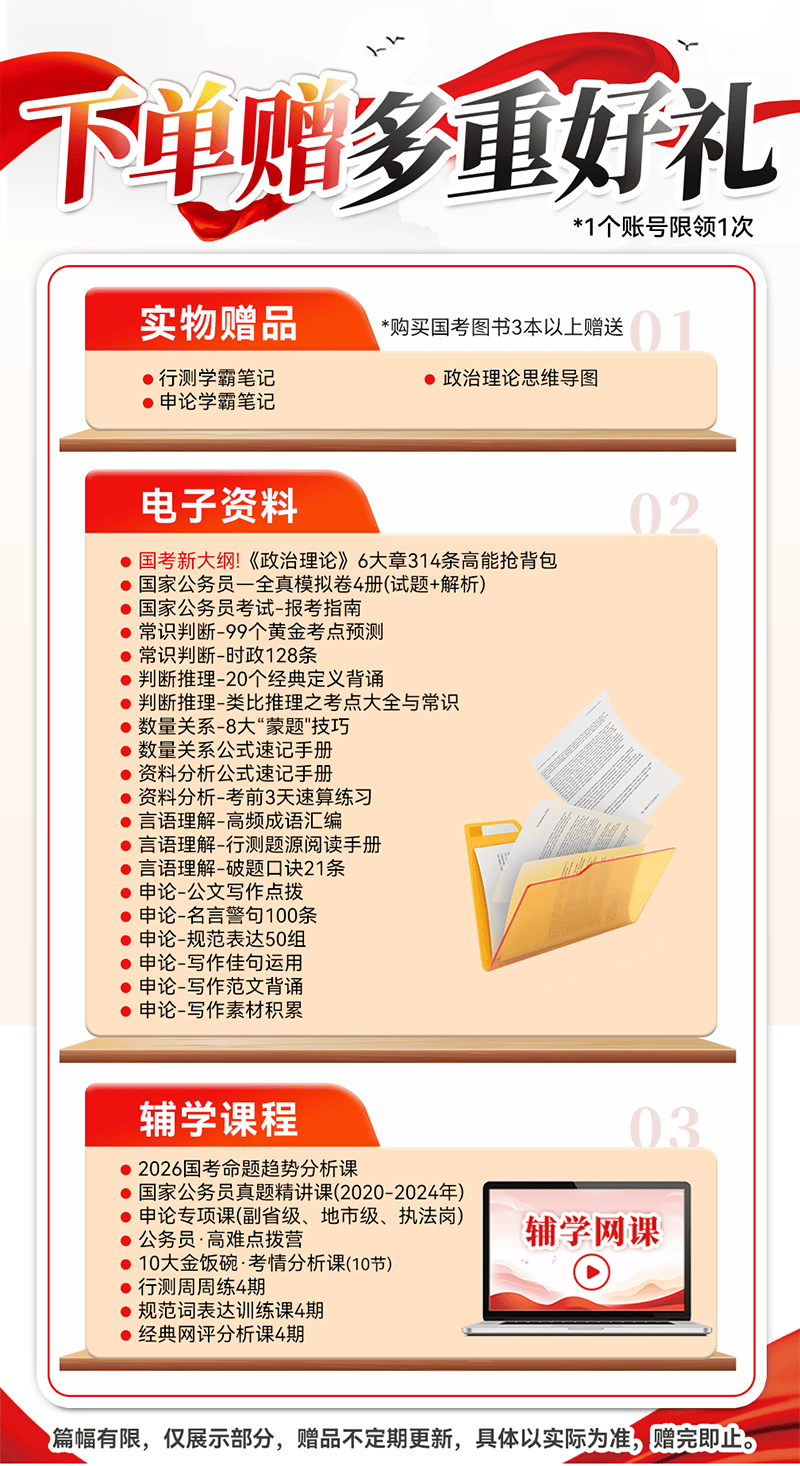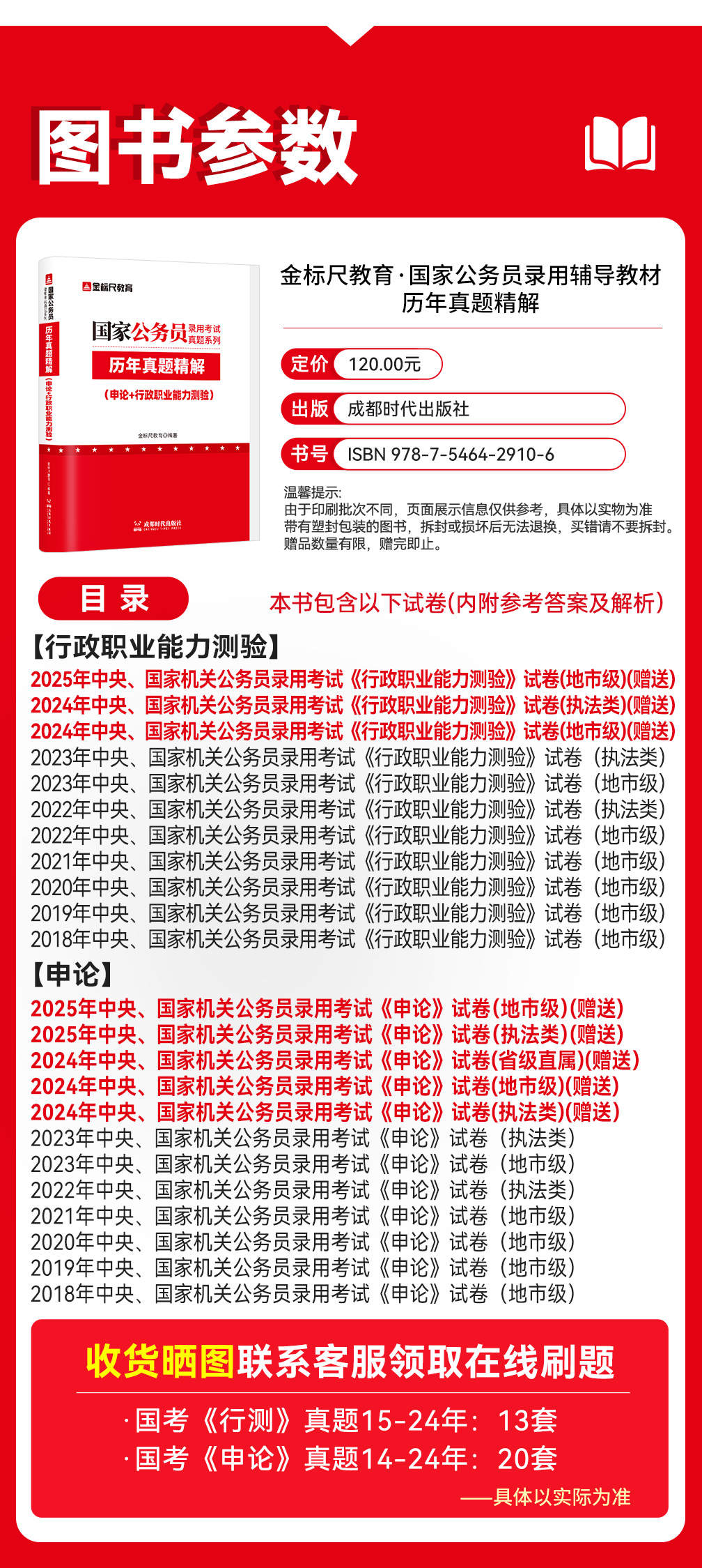 ①国考行测:五大版块《言语理解与表达、数量关系、判断推理、资料分析、常识判断》 ②申论:认知申论、材料阅读、归纳概括、提出对策、综合分析、应用文写作、文章写作 ③真题:行测已新增25年,申论新增25年,答案解析详细,结合理论知识对每个选项深入分析 ④搭配答题卡,真实体验作答,提高做题效率 ⑤购书后可以加微信:17725093951,领取更多岗位相关的电子资料