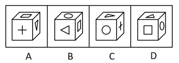 A 【解析】六面体。(本题为选非题)观察发现,四个选项都可以看到三角形右边的图案,以三角形底边为起点,画一个箭头指向三角形的顶点,此时可以观察到的只有A项的三角形右边对应十字面,其余选项三角形右边均对应圆形面。故本题答案为A项。